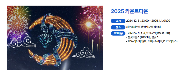 | 내용 | 드론 불꽃쇼, EDM 파티, 특별공연 |