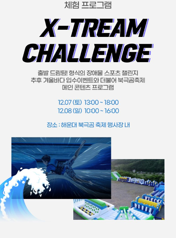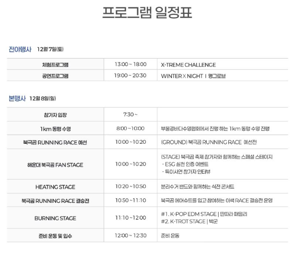 | 일정 | 전야행사 : 2024년 12월 6일(금) - Winter X 콘서트 본행사 : 2024년 12월 7일(토) - 북극곰 수영 대회 및 다양한 프로그램 마감행사 : 2024년 12월 8일(일) |