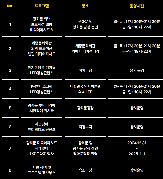 올해의 하이라이트는 미디어 아트 프로젝트 "루미너스 심포니"입니다. 네 개의 악장으로 구성된 이 작품은 서울의 역사적 배경과 미래 도시의 모습을 빛과 소리로 표현하며, 관객과의 상호작용을 통해 특별한 경험을 제공합니다. 중심축 프로그램인 'AXIS'는 빛의 변화를 시간의 흐름에 맞춰 보여주는 감각적인 체험을 선사합니다.