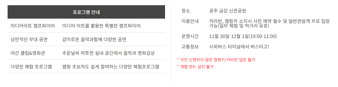 캠핑카와 카라반 이용자는 사전 예약이 필수이며, 현재 사전 예약이 마감된 상태입니다. 일반 방문객은 사전 신청 없이 참여 가능하지만 개별 텐트 설치는 불가합니다. 추운 날씨를 대비해 따뜻한 옷차림과 방한 용품을 챙겨 오시길 권장합니다.