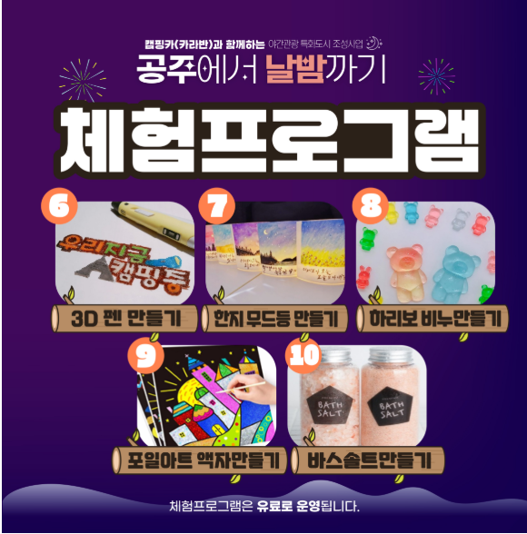 공주에서 열리는 이번 행사는 캠핑과 문화를 결합한 독특한 컨셉의 축제로, 아름다운 자연 경관 속에서 감성적인 공연과 다양한 체험 프로그램을 통해 캠핑의 매력을 느낄 수 있습니다.