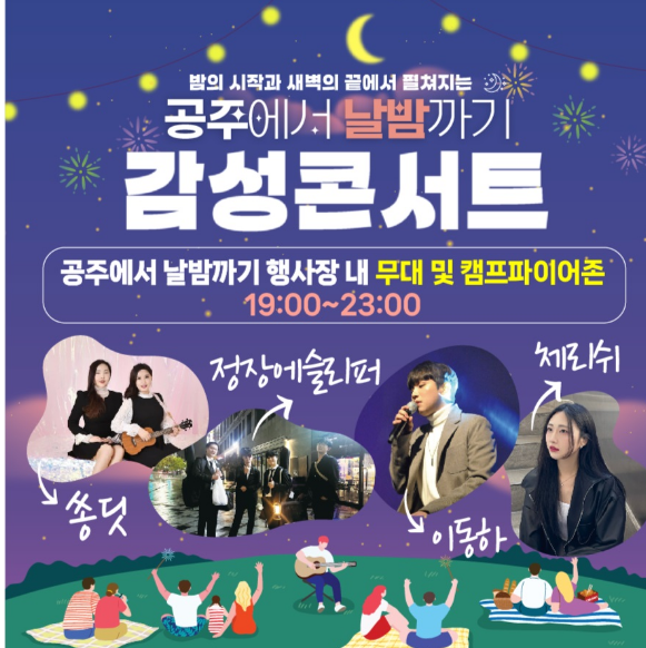 공주에서 열리는 이번 행사는 캠핑과 문화를 결합한 독특한 컨셉의 축제로, 아름다운 자연 경관 속에서 감성적인 공연과 다양한 체험 프로그램을 통해 캠핑의 매력을 느낄 수 있습니다.