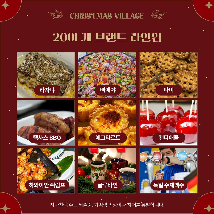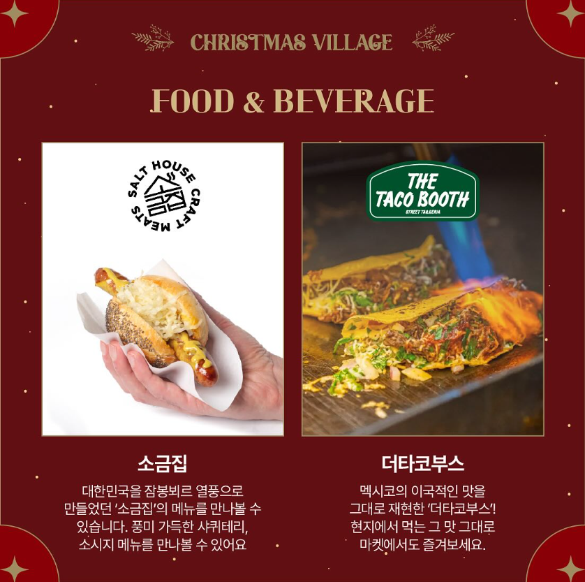 크리스마스 시즌에 유럽에서 즐겨 먹는 다양한 요리를 맛볼 수 있습니다. 전통적인 글뤼바인(따뜻한 와인), 독일식 소시지, 이탈리아 디저트 등 세계 각국의 별미들이 준비되어 있어 입맛을 만족시켜줍니다.