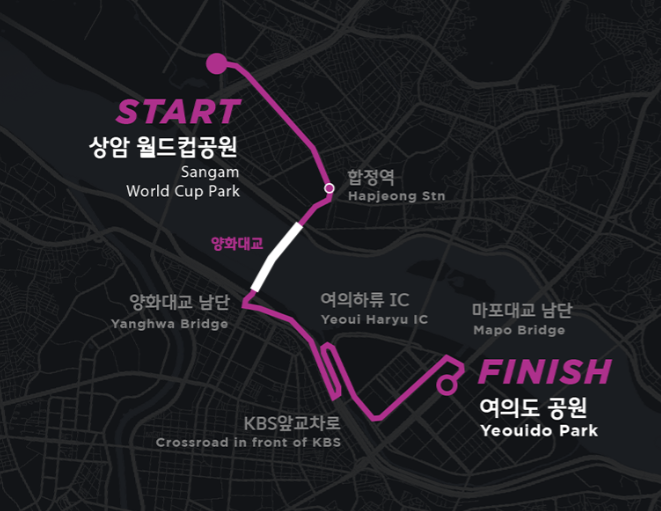 10K 코스는 상암 월드컵공원에서 여의도공원까지 이어집니다. 이 코스 역시 주요 지점에 급수대가 배치되어 있어, 참가자들이 경주 도중 충분한 수분을 보충할 수 있습니다.