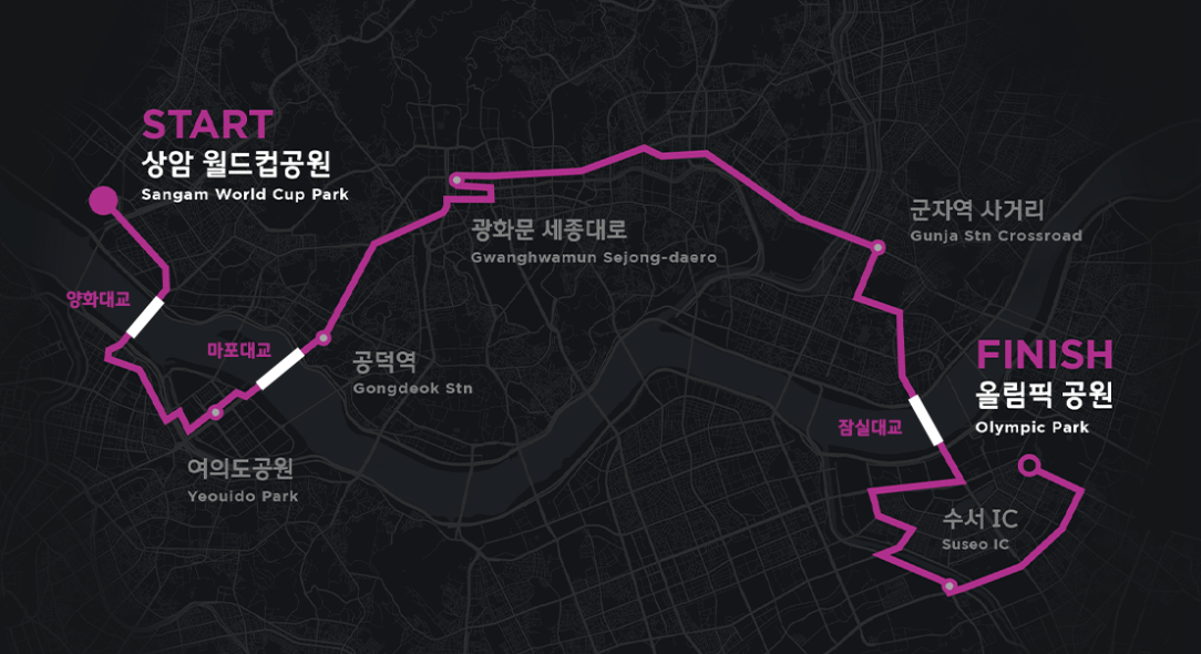 풀코스는 상암 월드컵공원에서 시작하여 올림픽공원에서 종료됩니다. 삼청동의 업힐 구간은 현재 공사 중이라 코스가 일부 변경되었습니다. 제한 시간은 5시간이며, 주요 지점을 포함해 충분한 급수대가 배치되어 있습니다.