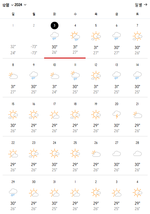 괌의 12월 날씨는 따뜻하고 쾌적한 편입니다. 평균 기온은 24~30℃로, 낮에는 덥지만 저녁에는 선선한 바람이 불어 시원합니다.