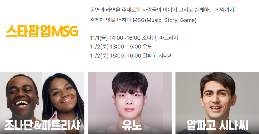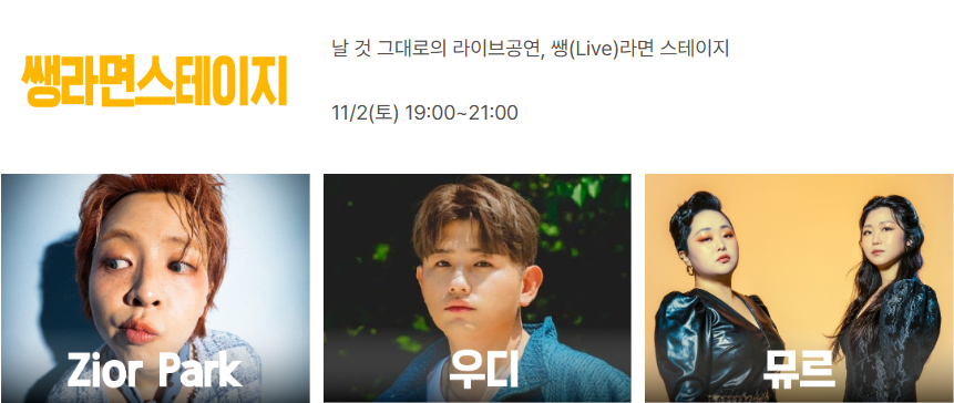 또한, 11월 2일 토요일에는 Zior Park, 우디, 뮤르가 출연하는 쌩라면스테이지가 열립니다. 축제 현장에서 라면과 함께 신나는 공연을 즐겨보세요.