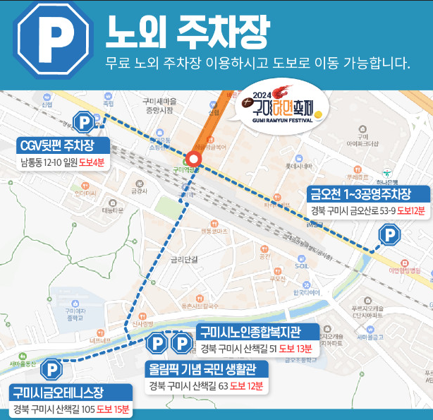 축제 기간 동안 구미역 인근에 무료 주차장이 운영되며, 구미역과 주요 행사장 간의 교통 혼잡을 줄이기 위해 셔틀버스가 운행됩니다. 셔틀버스는 금오산대주차장, 구미시청, 구미복합스포츠센터 등에서 20분 간격으로 운행되며, 김천구미역에서는 30~40분 간격으로 리무진 버스를 통해 축제장까지 이동할 수 있습니다.