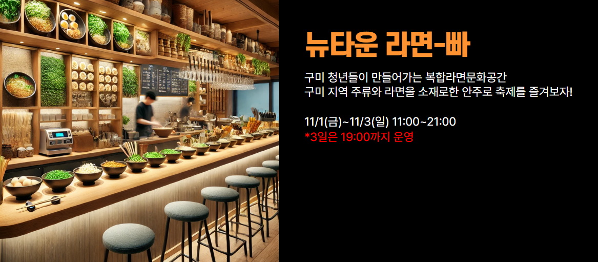 구미 지역의 주류와 라면이 만나는 특별한 공간, 뉴타운 라면-빠에서는 라면과 함께 어울리는 다양한 주류를 즐길 수 있습니다. 축제 기간 동안 한정적으로 운영되며, 색다른 분위기 속에서 맛과 향을 동시에 즐길 수 있는 특별한 경험을 제공합니다.