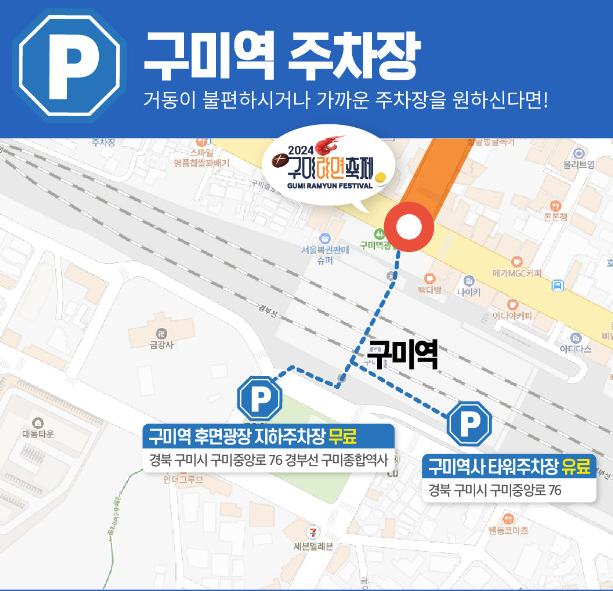 축제 기간 동안 구미역 인근에 무료 주차장이 운영되며, 구미역과 주요 행사장 간의 교통 혼잡을 줄이기 위해 셔틀버스가 운행됩니다. 셔틀버스는 금오산대주차장, 구미시청, 구미복합스포츠센터 등에서 20분 간격으로 운행되며, 김천구미역에서는 30~40분 간격으로 리무진 버스를 통해 축제장까지 이동할 수 있습니다.