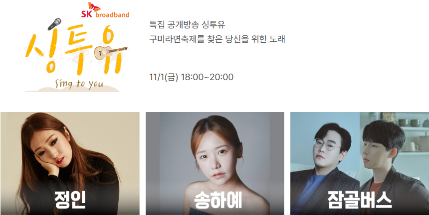 축제 기간 동안 다양한 공연이 펼쳐지며, 방문객들은 즐거운 시간을 보낼 수 있습니다. 11월 1일 금요일 저녁에는 정인, 송하예, 잠골버스가 참여하는 '싱투유' 특집 공개방송이 예정되어 있습니다.