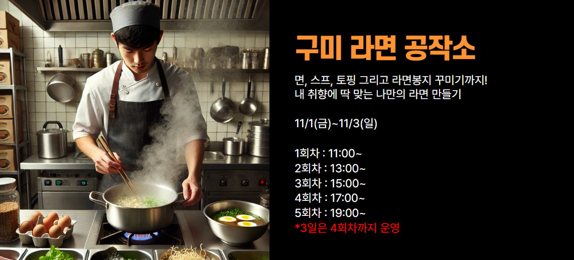 나만의 라면을 만들어볼 수 있는 구미 라면 공작소가 1일 5회씩 운영됩니다. 참가자들은 다양한 재료와 토핑을 사용해 자신만의 독특한 라면을 만들어 볼 수 있으며, 이 프로그램은 온 가족이 함께 즐기기에 좋습니다. 사전 예약이 필요할 수 있으니 축제장을 방문하기 전에 확인해보세요.