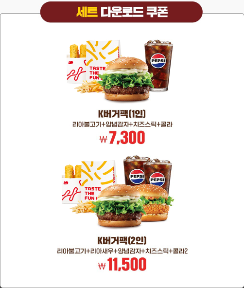 - 리아 불고기 + 리아 새우 + 양념감자 + 치즈스틱 + 콜라 2잔 (2인팩) 11,500원 (26% 할인)