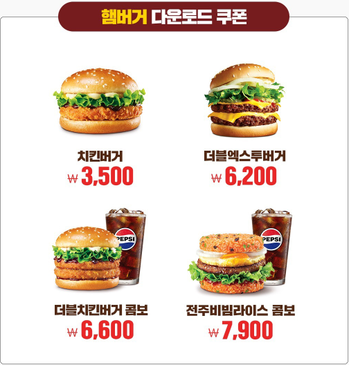 롯데리아에서 제공하는 이달의 쿠폰은 12월 한 달 동안 다양한 메뉴를 할인된 가격에 이용할 수 있는 기회를 제공합니다. 치킨버거와 더블엑스투버거 단품부터, 전주비빔라이스 콤보, 1인팩과 2인팩 등의 패키지 메뉴까지 다양한 옵션이 포함되어 있습니다.