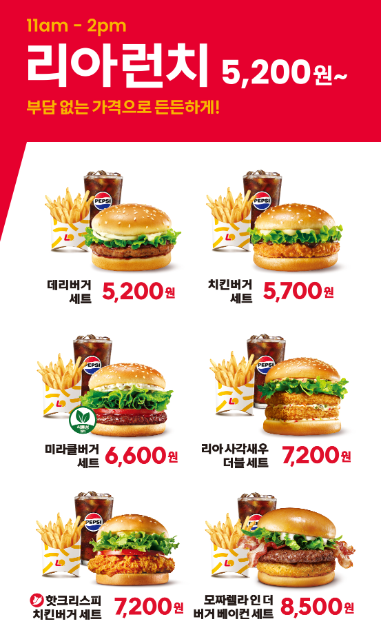 점심시간을 합리적인 가격으로 즐기고 싶으신가요? 매일 오전 11시부터 오후 2시까지 진행되는 리아런치는 다양한 세트 메뉴를 할인된 가격에 제공합니다. 배달 서비스가 아닌 매장 방문 고객에게만 제공되는 혜택이니, 점심시간에 매장을 방문하여 더욱 풍성한 식사를 즐겨보세요.