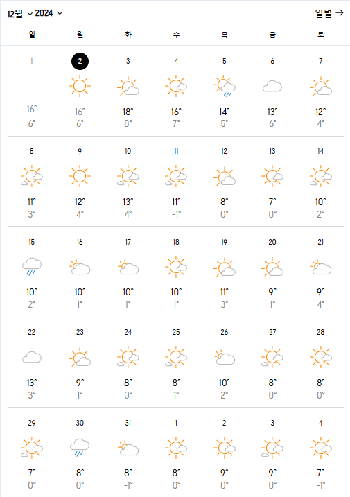 | 12월 21일~31일 | 8°C | 2°C | 맑음 |