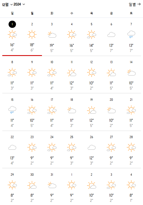 | 12월 초 | 4°C | 19°C | 구름/비 가능성 |