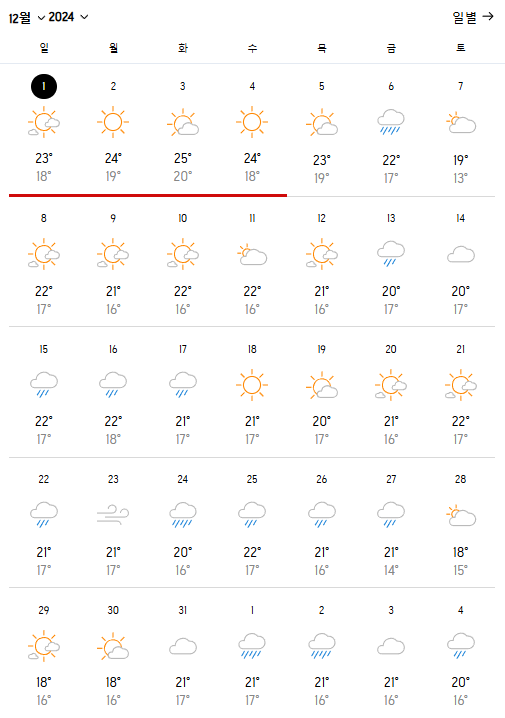 | 평균 낮 기온 | 평균 밤 기온 | 강수량 |