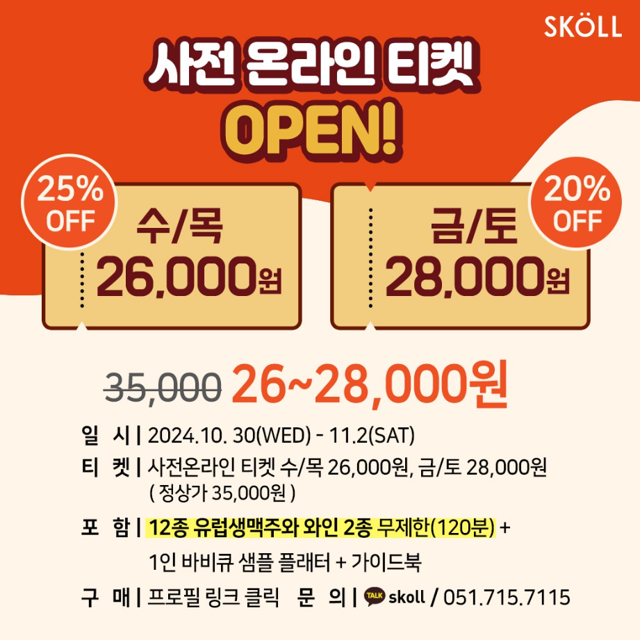 부산 가을 맥주축제는 2024년 10월 30일 수요일부터 11월 2일 토요일까지 나흘간 부산 서면 스콜에서 개최됩니다. 축제 기간 동안 방문객들은 하루 최대 2시간 동안 다양한 유럽 생맥주와 와인을 무제한으로 즐길 수 있습니다. 특히, 축제의 마지막 날에는 운영 시간이 더 길어져 오후 1시부터 자정까지 이용이 가능합니다.