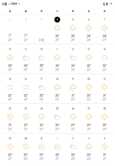 방콕의 12월은 건기 시즌에 해당하며, 비교적 시원하고 쾌적한 날씨가 이어집니다. 평균 기온은 24~31℃로 낮 동안은 따뜻하지만 아침과 저녁에는 조금 선선할 수 있습니다. 강수 확률은 매우 낮으며, 맑은 날씨가 지속됩니다. 이 시기의 습도는 다른 계절에 비해 낮아 더욱 쾌적하게 느껴질 수 있습니다.