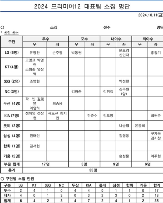 WBSC 프리미어 12 팀 코리아 선수단 프로필 [더보기]