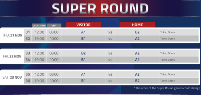 슈퍼라운드는 11월 21일부터 23일까지 도쿄돔에서 열리며, A조와 B조에서 각각 상위 두 팀이 진출해 경기를 치르게 됩니다. 이 라운드에서 각 조의 1위와 2위가 서로 교차하여 맞붙으며, 그 결과에 따라 결승 진출 팀이 결정됩니다.