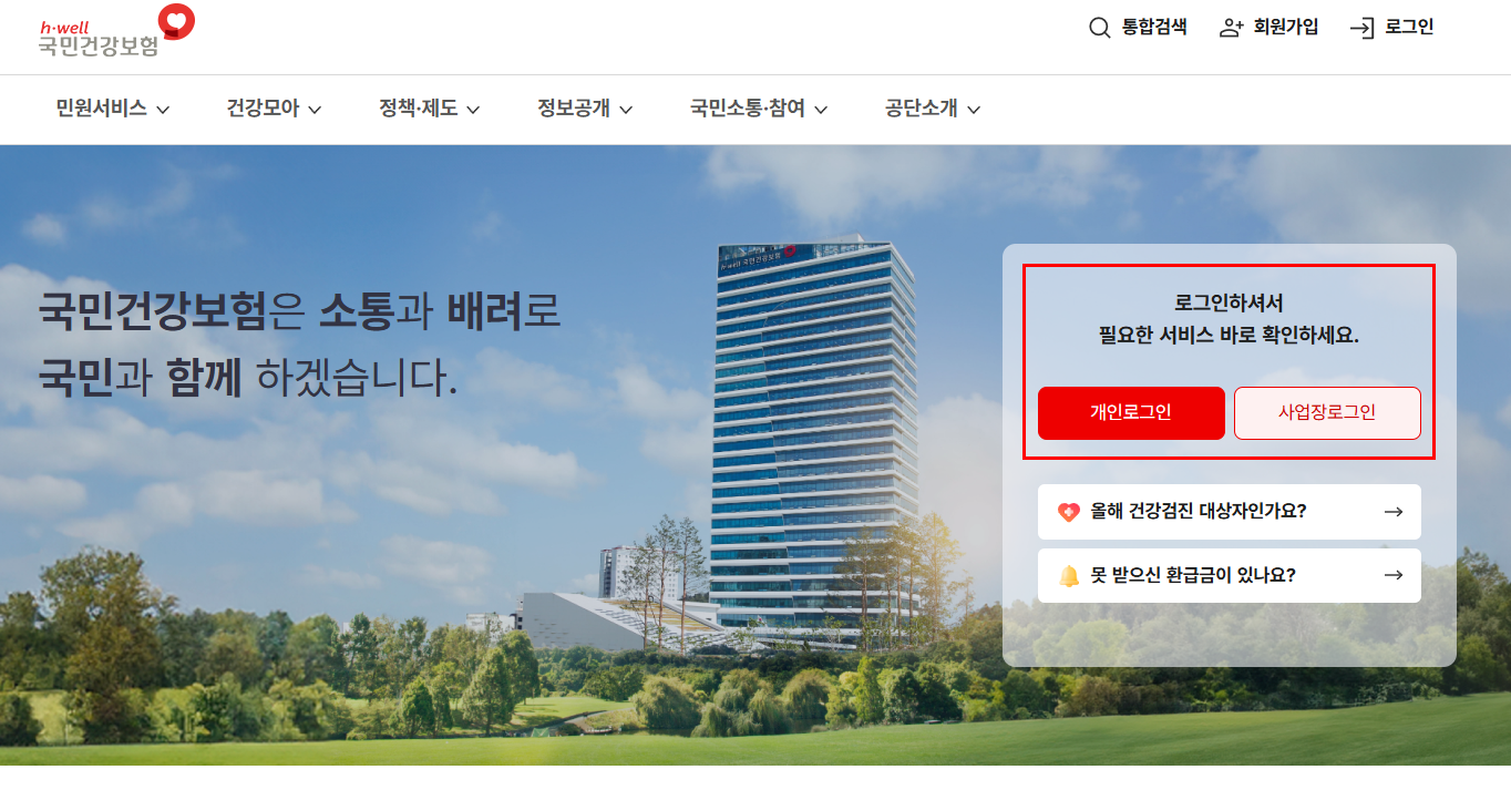 - 국민건강보험공단 홈페이지에 접속합니다.