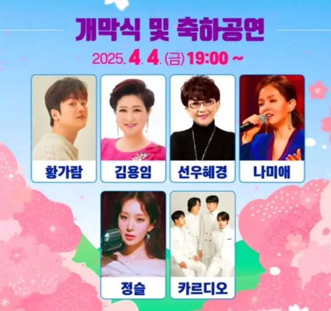 4월 4일 저녁 7시, 정읍 천변 어린이축구장에서 개막식 축하 공연이 열립니다. 화려한 라인업의 가수들이 무대를 꾸미며 축제의 시작을 알립니다. 따뜻한 봄밤, 감미로운 음악과 함께 특별한 시간을 보내세요.