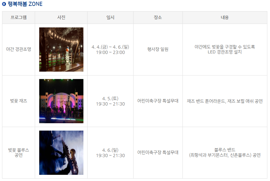 | 주요 행사 | 개막식 및 축하 공연, 벚꽃 재즈, 버스킹, 차 없는 거리 등 |