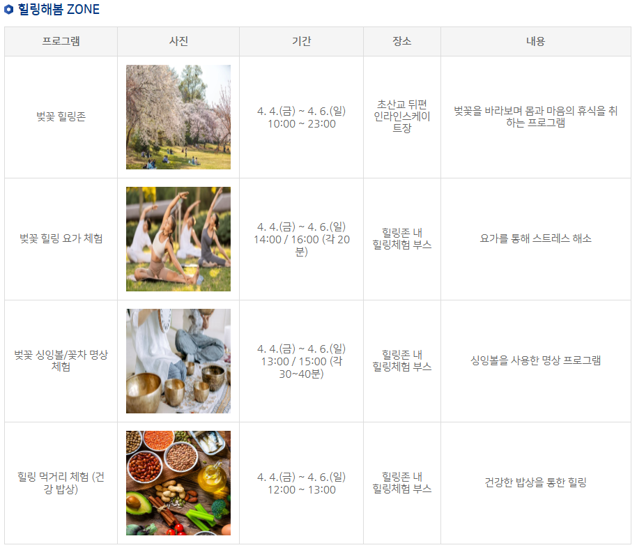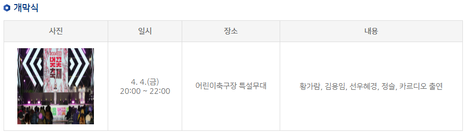 | 주요 행사 | 개막식 및 축하 공연, 벚꽃 재즈, 버스킹, 차 없는 거리 등 |