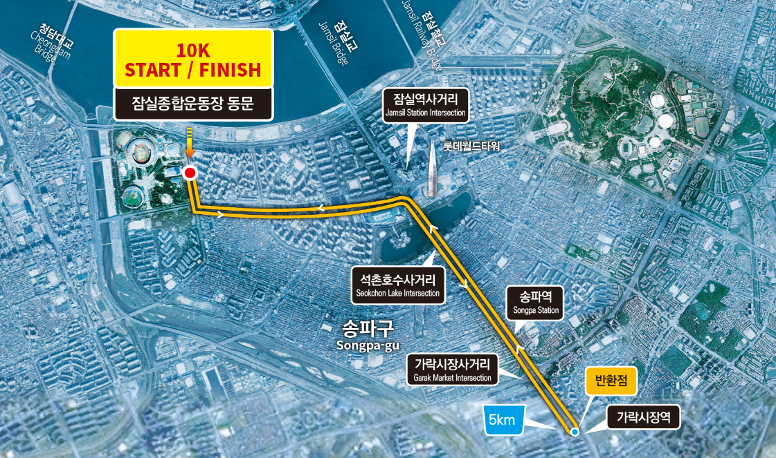 10km 코스는 잠실종합운동장에서 시작하고 끝나는 순환형 코스입니다. 잠실운동장 동문에서 출발해 석촌호수를 지나 가락시장역을 반환점으로 돌아오는 코스입니다. 서울 내에서 송파 지역을 달릴 수 있는 거의 유일한 코스로, 비교적 짧은 거리이지만 도심 속 경관을 즐기기에 안성맞춤입니다.