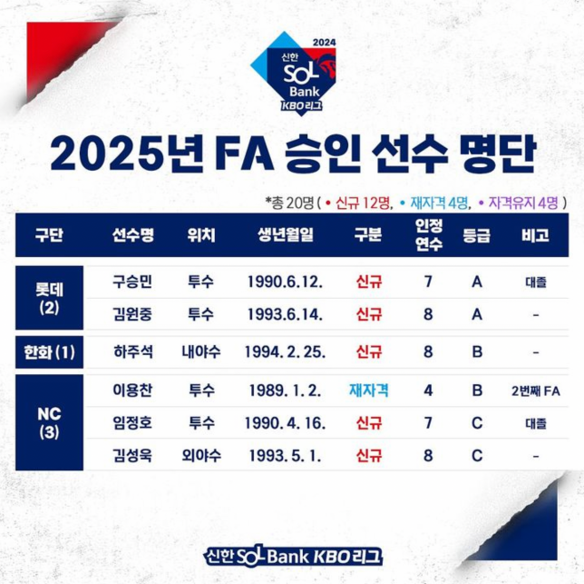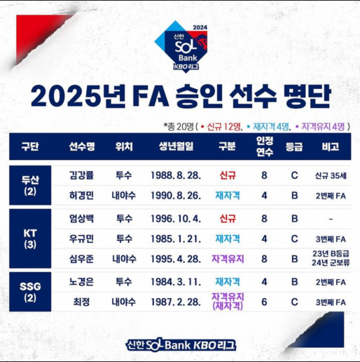 2025년 FA 승인 선수 명단