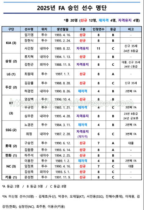 2025년 KBO 리그 FA 자격을 얻은 선수는 총 30명이었으며, 그중 20명이 최종적으로 FA 승인을 받았습니다. 이 선수들은 11월 6일부터 국내외 구단과 자유롭게 협상을 시작할 수 있는 자격을 갖췄습니다.