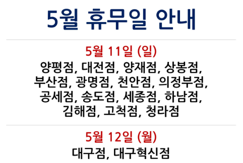 5월은 공휴일 및 정기 휴무일이 포함되어 있어 일부 지점은 일요일과 월요일, 수요일에 운영하지 않습니다. 매장별로 휴무일이 다르므로 방문 전 반드시 확인하시기 바랍니다.