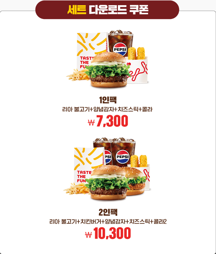 | 버거 세트 할인 | 불고기버거, 새우버거 세트 할인 | 앱에서 쿠폰 다운로드 후 사용 |