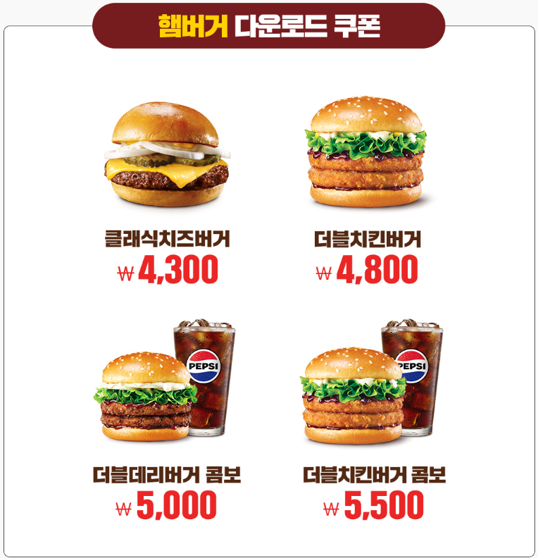 | 버거 세트 할인 | 불고기버거, 새우버거 세트 할인 | 앱에서 쿠폰 다운로드 후 사용 |