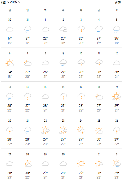| 평균 기온 | 최고 기온 | 최저 기온 | 강수량 | 습도 |