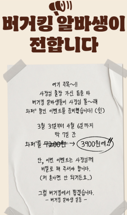 버거킹에서는 4월 1일 만우절을 맞아 한정 기간 동안 와퍼를 특가에 제공합니다. 이 기회를 놓치지 마세요!