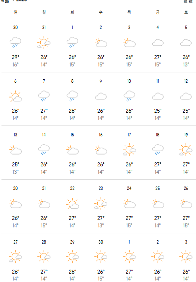| 기온 | 16~18℃ | 25~28℃ | 약 50~100mm |