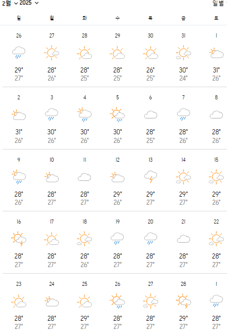 | 2월 | 27°C | 30°C | 25°C | 5mm | 70% |