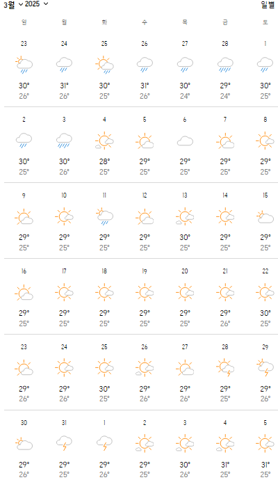 2025년 3월 24℃ 30℃ 50~80mm 70~80% 맑고 건조한 날씨