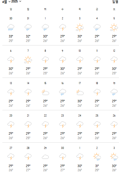 4월은 건기와 우기가 혼합된 시기로, 짧고 강한 소나기가 내릴 가능성이 높습니다. 하지만 하루 종일 비가 오는 경우는 드뭅니다.