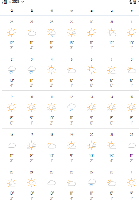 | 2월 말 | 12°C | 3°C |