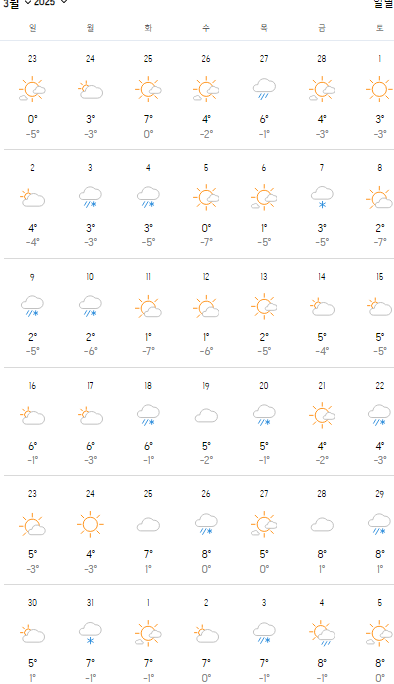 | 3월 초 | -3°C ~ 3°C | 눈이 내릴 가능성이 있음 |