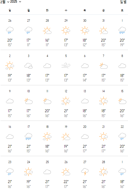 | 2월 | 15~20°C | 20~22°C | 12~15°C |