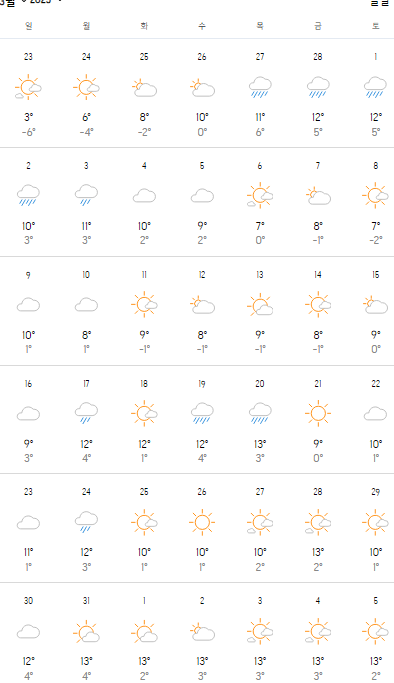 | 3월 중순 | 4°C | 16°C | 90mm |