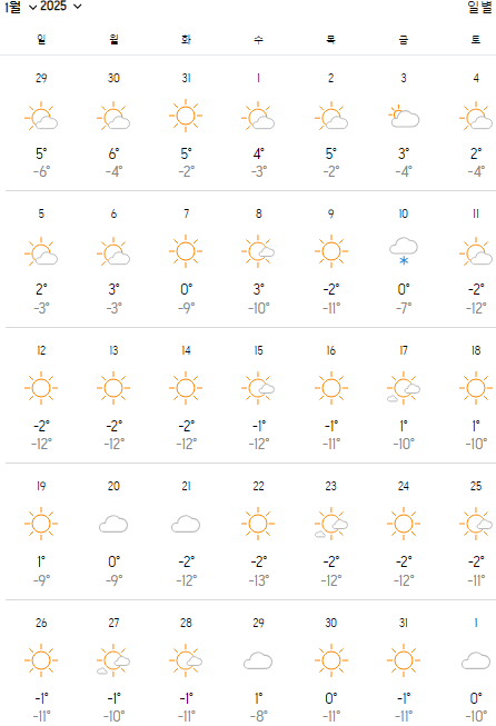| 1월 | 2°C | -10°C | 3mm | 6~7시간 |