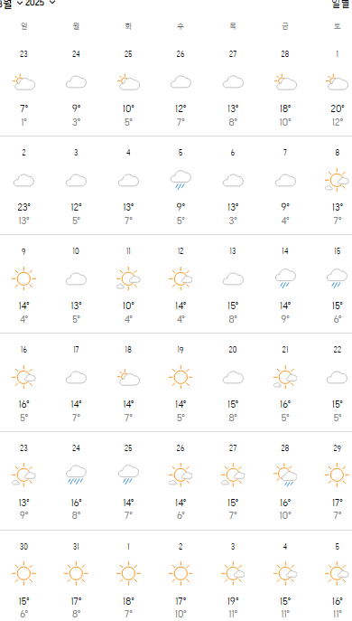 • 얇은 니트 또는 가디건: 낮에는 기온이 15도 이상으로 오르므로 너무 두꺼운 옷보다는 가볍게 입을 수 있는 옷이 좋습니다.