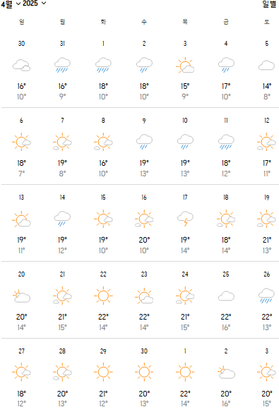 | 4월 말 | 15~17°C | 21~24°C | 60~80mm | 75~85% | 따뜻하지만 습도 높음 |