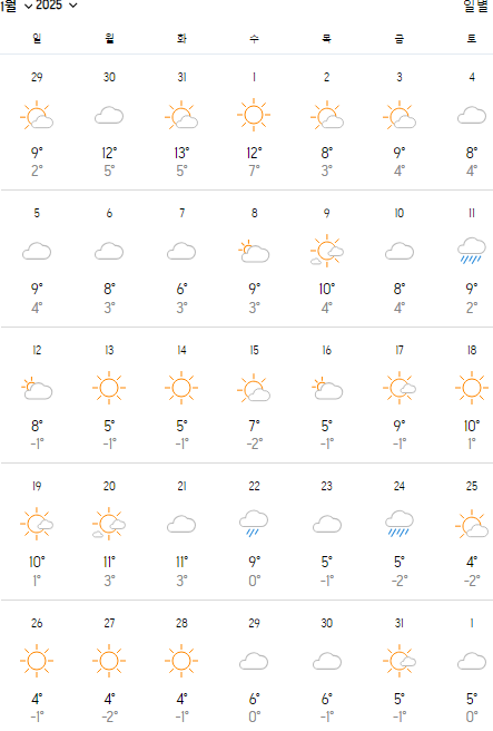 | 평균 최저 기온 | 평균 최고 기온 | 강수량 | 기타 |